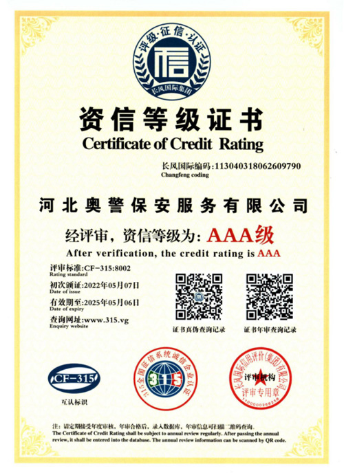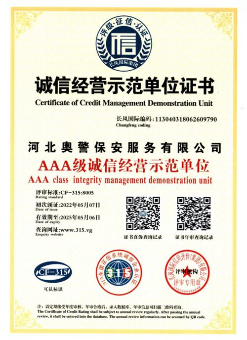 河北奧警保安服務(wù)有限公司成立于2017年7月20日,注冊資金1000萬元,具有中華人民共和國《保安服務(wù)許可證》(編號(hào):冀公保服20180085)的綜合性安保企業(yè)。